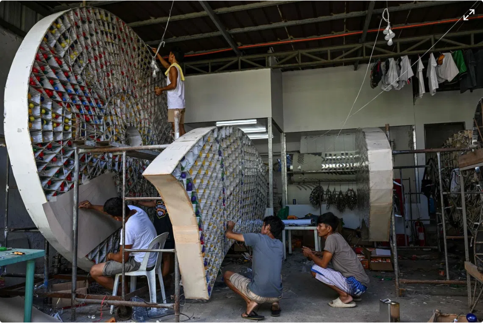 在菲律宾圣费尔南多市,灯笼制作工人忙着组装巨型灯笼,以参与今年的灯笼节。
