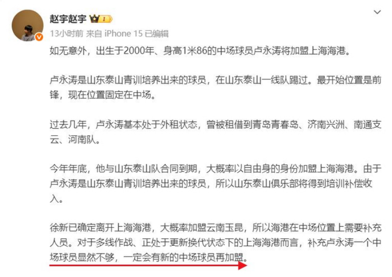 另外,赵宇还透露,因为卢永涛出自鲁能青训,所以他加盟上海海港后,山东泰山也将会得到一定数额的青训补偿,而鉴于张源、卢永涛均在当打之年,且均具备进入国足的实力,所以上海海港的中场实力将会得到进一步提升,尤其是卢永涛本赛季租借至河南队后,也是彻底证明了自己,他加盟上海海港后,也将会完美的填补徐新留下的位置。