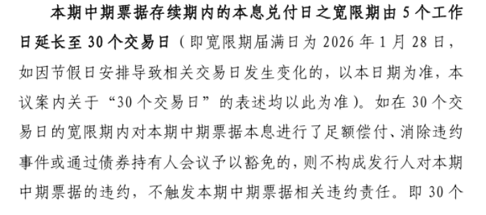同时,“如在30个交易日的宽限期内对本期中期票据本息进行了足额偿付、消除违约事件或通过债券持有人会议予以豁免的,则不构成发行人对本期中期票据的违约,不触发本期中期票据相关违约责任。”