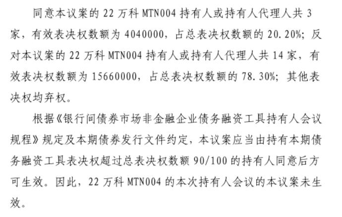 万科在23日发布的《关于在交易商协会披露<关于2022年度第四期中期票据2025年第二次持有人会议的答复公告>的提示性公告》中表示,中期债券22万科MTN004因“反对本议案的22万科MTN004持有人或持有人代理人共14家,占总表决权数额的78.30%”,“因此,22万科MTN004的本次持有人会议的本议案未生效”。