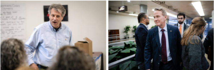 (左图)2024年11月4日,时任联邦参议员谢罗德‧布朗(Sherrod Brown,民主党/俄亥俄州)在俄亥俄州克利夫兰高地(Cleveland Heights)的一个竞选办公室向志愿者发表讲话。(右图)2025年2月18日,联邦参议员乔恩‧赫斯特德(Jon Husted,共和党/俄亥俄州)前往美国国会大厦投票。布朗在2024年的选举中落败,如今正试图取代赫斯特德,因为赫斯特德被州长迈克‧德瓦恩任命填补了副总统JD‧万斯留下的空缺。