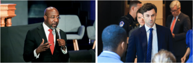 (左图)2024年10月20日,联邦参议员拉斐尔‧沃诺克(Raphael Warnock,民主党/乔治亚州)在乔治亚州琼斯伯勒(Jonesboro)的一场竞选活动上发表讲话。(右图)2025年6月26日,联邦参议员乔恩‧奥索夫(Jon Ossoff,民主党/乔治亚州)在华盛顿参加完一场参议院机密简报会后离开。共和党人为了扭转在该州参议院选举中的连败颓势,派出了众多候选人。