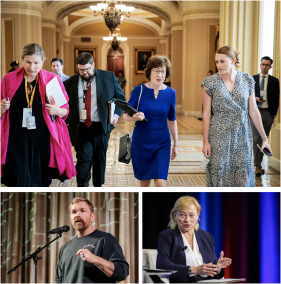 (上图)2025年7月28日,联邦参议员苏珊‧柯林斯(Susan Collins,共和党/缅因州)与工作人员在美国国会大厦内行走。(左下图)2025年10月22日,美国参议院候选人、美国海军陆战队退伍军人兼牡蛎养殖户格雷厄姆‧普拉特纳(Graham Platner)在缅因州奥甘奎特镇(Ogunquit)的市政厅会议上发表讲话。(右下图)2023年5月4日,缅因州州长、民主党人珍妮特‧米尔斯(Janet Mills)在马里兰州国家港湾市(National Harbor)的一次活动上发表讲话。