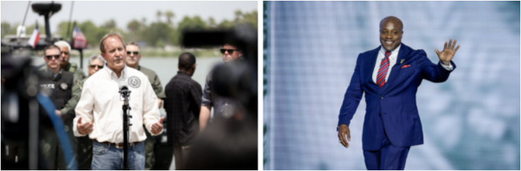 (左图)2021年4月28日,德克萨斯州总检察长肯‧帕克斯顿(Ken Paxton)在德克萨斯州麦卡伦(McAllen)附近的安萨尔杜亚斯公园(Anzalduas Park)举行新闻发布会。(右图)2024年7月15日,联邦众议员韦斯利‧亨特(Wesley Hunt,共和党/德克萨斯州)在威斯康星州密尔沃基(Milwaukee)举行的共和党全国代表大会(Republican National Convention)上登台。帕克斯顿和亨特都在竞选接替现任联邦参议员约翰‧科宁(John Cornyn,共和党/德克萨斯州)的席位。