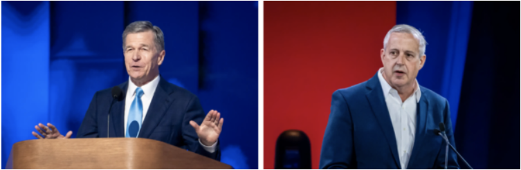 (左图)时任北卡罗来纳州州长罗伊‧库珀(Roy Cooper)于2024年8月22日在芝加哥举行的民主党全国代表大会最后一天发表讲话。(右图)共和党全国委员会主席迈克尔‧沃特利(Michael Whatley)于2024年6月22日在华盛顿举行的“通往多数之路”(2024 Road to Majority Conference)大会上发表讲话。两人均在竞选即将退休的联邦参议员汤姆‧蒂利斯(Thom Tillis,共和党/北卡罗来纳州)留下的席位。