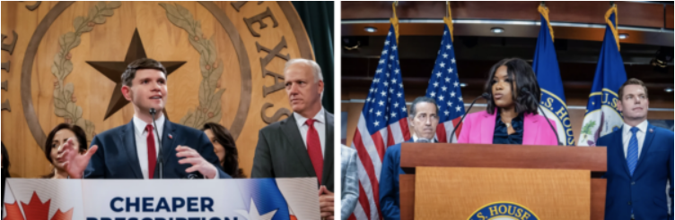 (左图)2023年4月12日,德克萨斯州众议员詹姆斯‧塔拉里科(James Talarico)讨论药品定价问题。(右图)2025年9月8日,联邦众议员贾斯敏‧克罗克特(Jasmine Crockett,民主党/德克萨斯州)在华盛顿国会山发表讲话。两人目前在民主党初选中领先,角逐联邦参议员约翰‧科宁(John Cornyn,共和党/德克萨斯州)的席位。