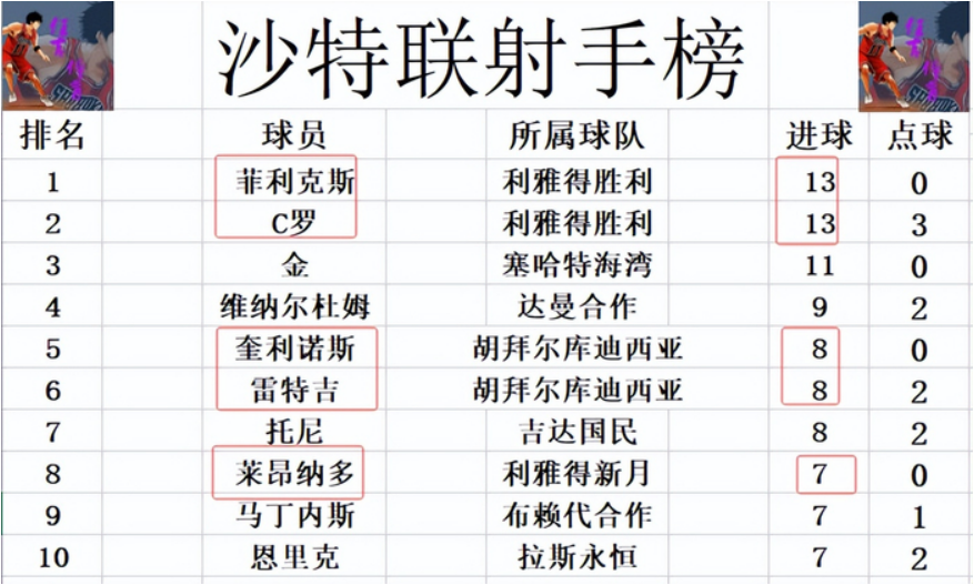 射手榜方面,C罗,菲利克斯依然是13球并列第1,金2球之差紧随其后排在第3,维纳尔杜姆9球位列第4。奎利诺斯和雷特吉今天各入1球,追上托尼,三人8球并列第5。莱昂纳多打入锁定胜局一球,追上马丁内斯和恩里克,将前十门槛提高到7球。