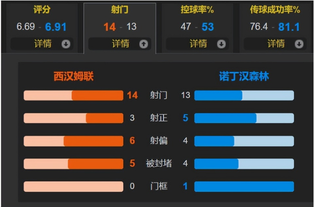 全场比赛,西汉姆联的控球率为47%,一共有14次射门,其中3次射正;诺丁汉森林一共有13次射门,其中5次射正。