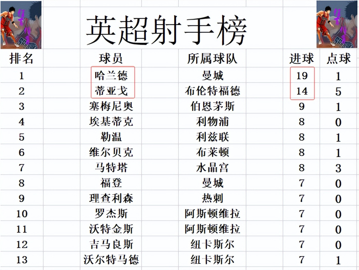 射手榜方面,哈兰德19球继续领跑,蒂亚戈4球之差紧随其后,其他人就还没有进球上双,即将6500万英镑加盟曼城的塞梅尼奥9球排在第3。福登,理查利森,沃特金斯,吉马良斯等人7球刚好挤入前十。