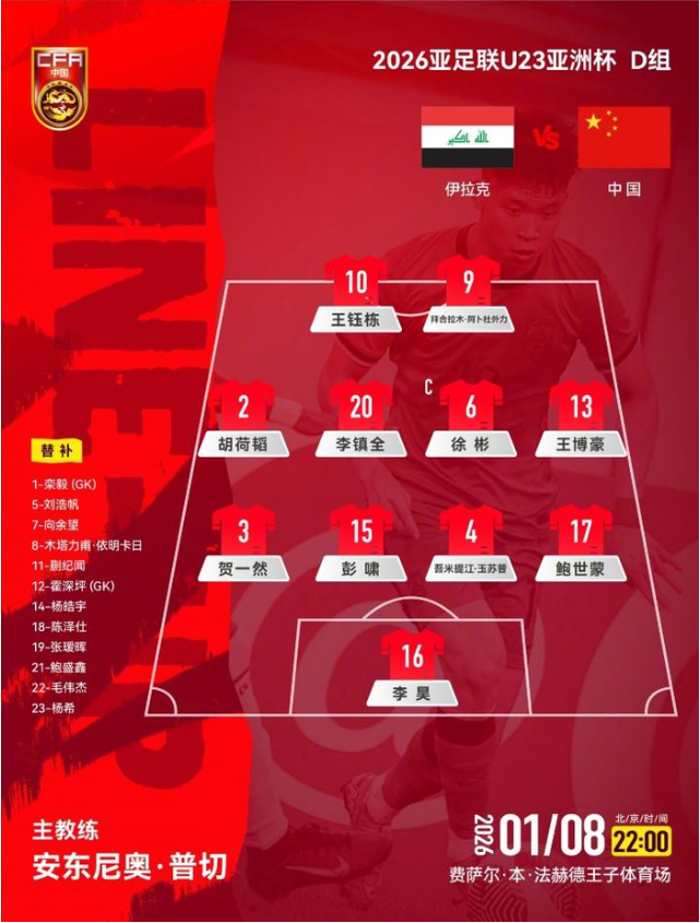 值得一提的是,这是中国队第6次参加U23亚洲杯,而在前五届比赛,中国队均止步小组赛,反观本场对手伊拉克队,他们此前曾拿到两次冠军,所以中国队此役要想在伊拉克队身上拿分并不容易,但是鉴于伊拉克队此次并未派全主力参赛,中国队未必没有取胜的机会。