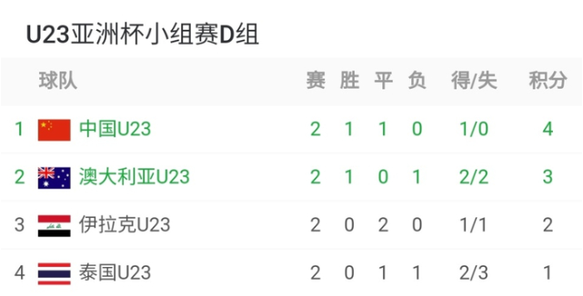 今天凌晨,U23亚洲杯小组赛第二轮最后一场比赛结束,泰国队1-1逼平了伊拉克队,而这场比赛也是关乎中国队晋级的形势。在这场比赛结束之后,中国队所在的D组积分榜发生较大变化。