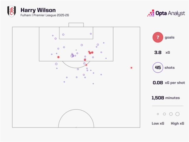 换句话说,按照普通英超球员的平均水准,在威尔逊这些射门条件下,大概只能进4球。但他进了7球。