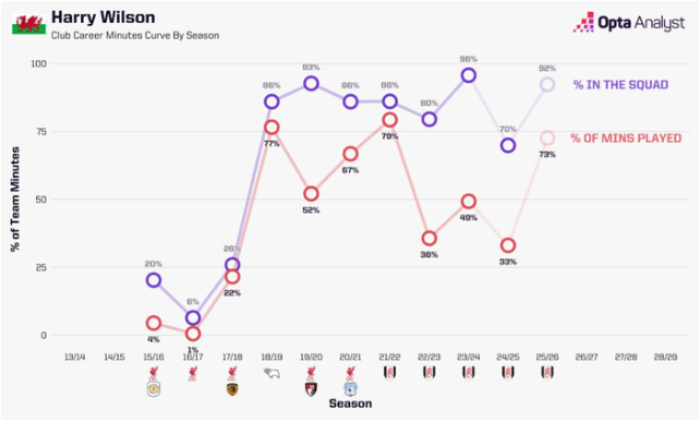 威尔逊已经在英超首发18场,这是他效力富勒姆以来的单赛季新高。