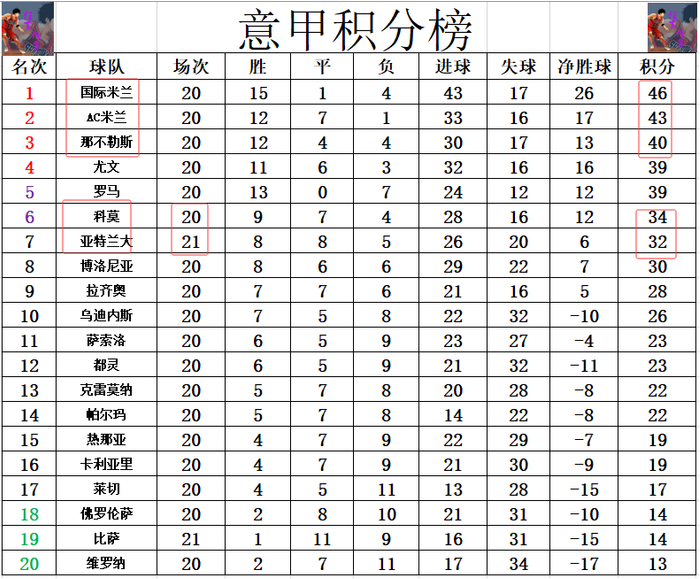 积分榜方面,国米和AC米兰本周中补赛都赢了球,国米还是3分优势力压AC米兰领跑,那不勒斯补赛无力赢球被拉开差距,落后国米6分,少AC米兰3分排在第3。亚特兰大今天要是能赢球夺得4连胜的话,就能追上黑马科莫,只是他们最后惨遭绝平,3连胜被终止,差科莫2分暂时还是排在第7。
