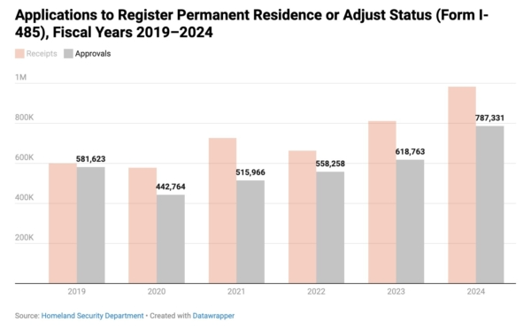 登记永久居留或调整身份(I-485表格)申请及获批数量示意图(2019—2024财政年度)。红色柱状图为申请数量,灰色柱状图为获批数量。(单位:份)(数据来源:美国国土安全部。应用软件:Datawrapper。