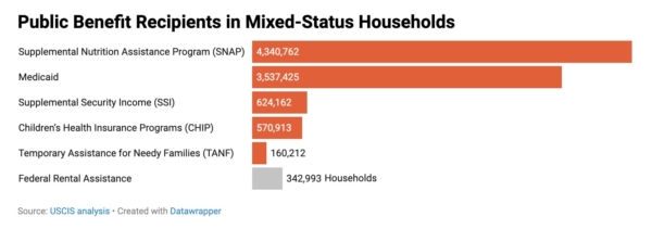 混合身份家庭中的公共福利受益人人数示意图。公共福利项目包括:补充营养援助计划(SNAP)、联邦医疗补助计划(Medicaid)、补充保障收入(SSI)、儿童健康保险计划(CHIP)、贫困家庭临时援助计划(TANF)、联邦住房租金补助(FRA)等。(单位:人)(数据来源:美国公民及移民服务局/USCIS。应用软件:Datawrapper。