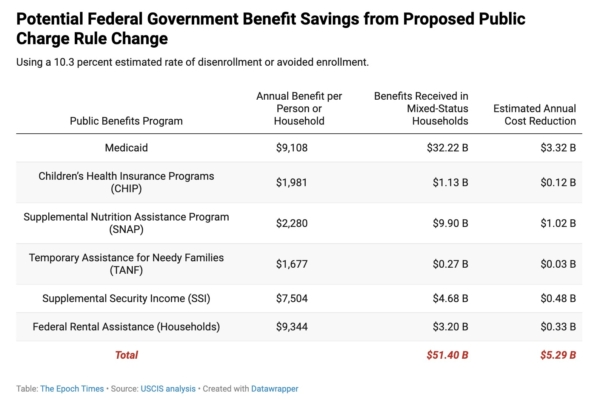 拟议的公共负担规则变更可能为联邦政府节省的福利支出示意图。公共福利项目包括:医疗补助计划(Medicaid)、儿童健康保险计划(CHIP)、补充营养援助计划(SNAP)、贫困家庭临时援助计划(TANF)、补充保障收入(SSI)、联邦住房租金补助(FRA)等。数据采用10.3%的预估退保率或避免参保率,对个人或家庭年度福利(Annual Benefit per Person or Household)、混合身份家庭获得的福利(Benefits Received in Mix-statues Households)和预计年度成本节约额(Estimated Annual Cost Reduction)进行计算。(单位:美元/B:十亿美元)(数据来源:美国公民及移民服务局/USCIS。应用软件:Datawrapper。