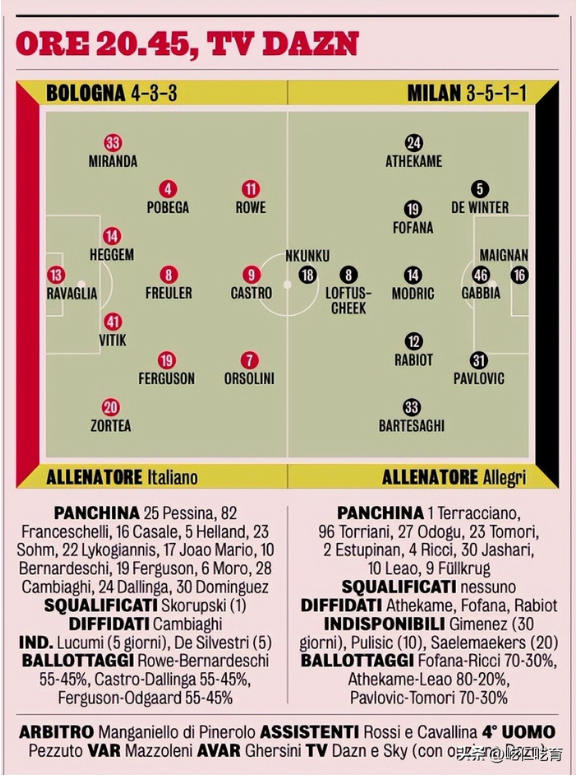 而从赛前媒体给出的首发预测来看,相较于上一场客场1-1打平罗马的比赛,本场的米兰或会在首发阵容进行些许的调整--莱奥或有可能被奇克取代,托莫里则有可能被帕夫洛维奇替换。