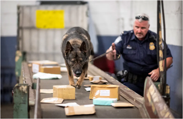 2019年6月24日,在纽约市约翰‧肯尼迪国际机场(John F. Kennedy Airport)的美国邮政服务(U.S. Postal Service)设施,一名美国海关与边境保护局(Customs and Border Protection)贸易和货物处(Trade and Cargo Division)的官员正与一只警犬合作检查包裹。