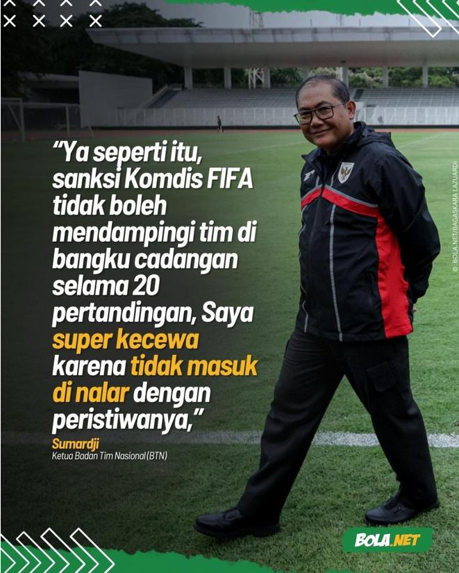 印尼媒体称,根据国际足联官方报告,苏马尔吉被认定存在严重违规,在纪律听证会上,苏马尔吉没有否认对他的指控,也没有为自己辩护。