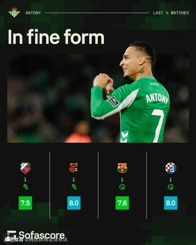 北京时间12月12日,本轮欧联杯比赛中,皇家贝蒂斯客场3-1击败萨格勒布迪纳摩,安东尼继续保持火热状态并完成破门。